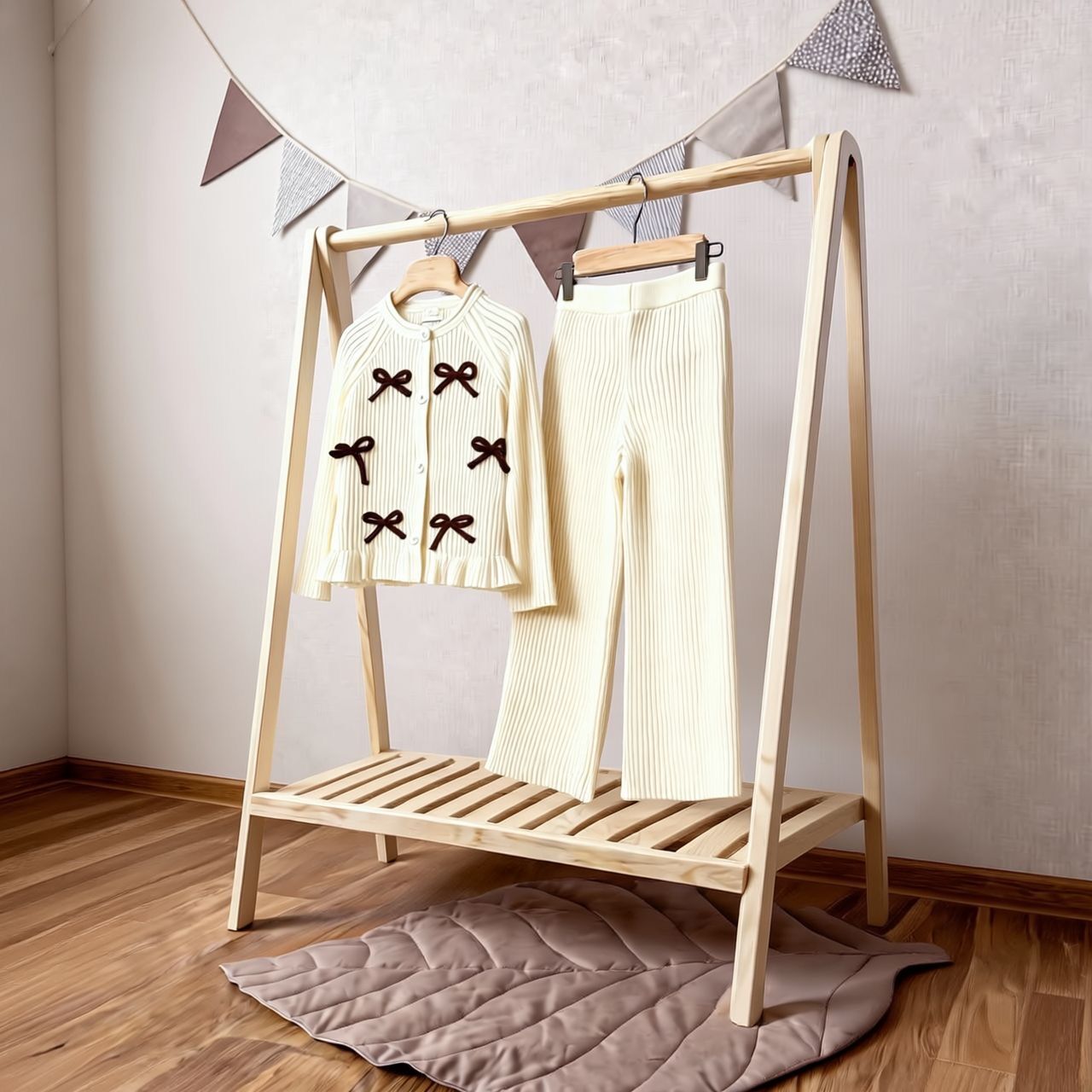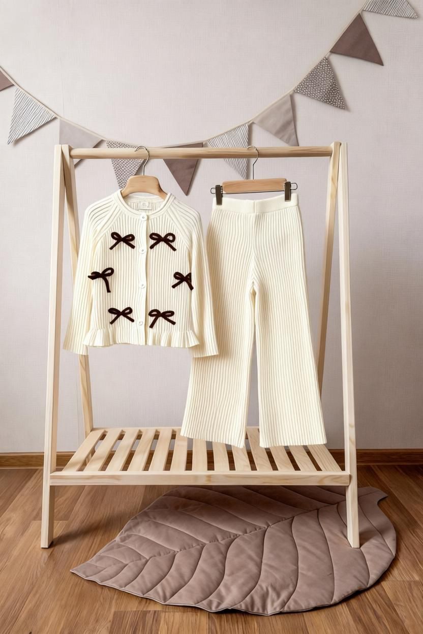 Kurdele detaylı triko takım krem